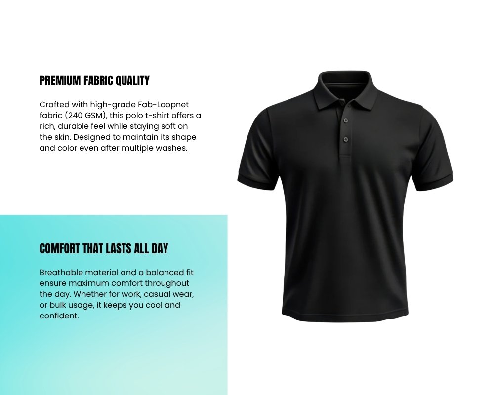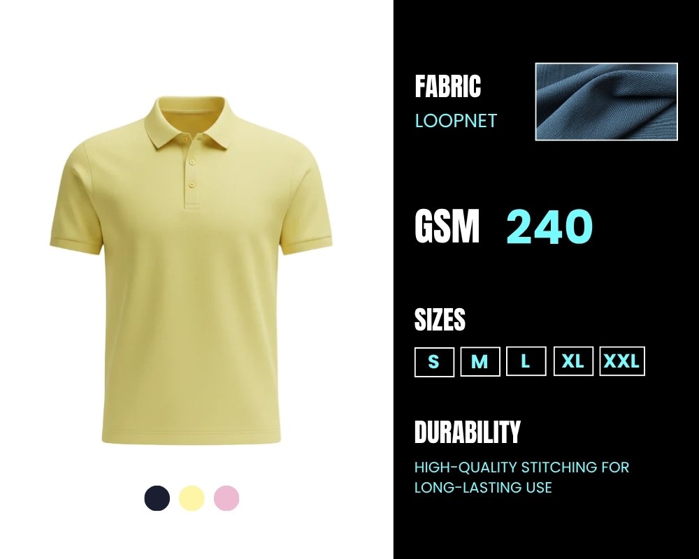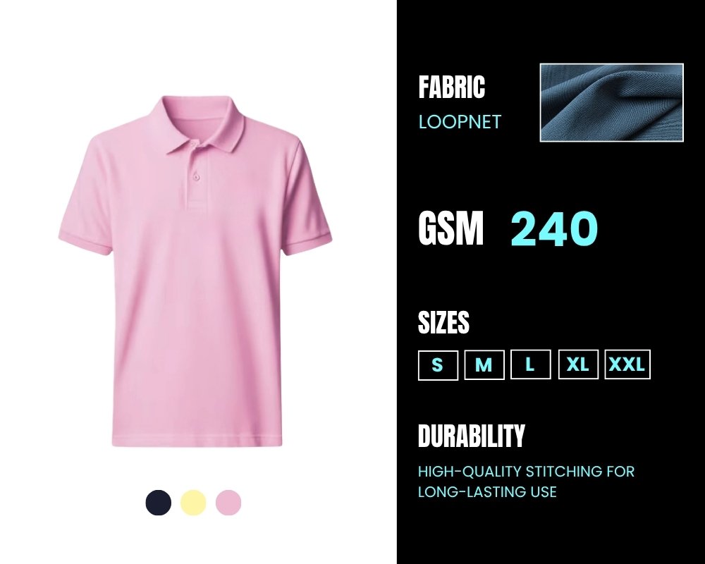 Each Polo T-shirt is made using Fab-Loopnet fabric with 240 GSM, offering a thick yet breathable feel. The material is soft on the skin while being durable enough for daily use.